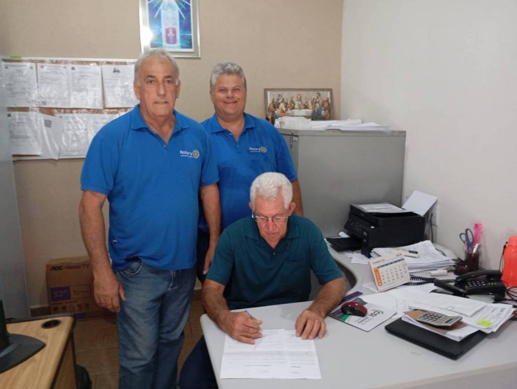 Foto com três pessoas vestidas de calça jeans e camiseta polo azul do Rotary: na esquerda um homem grisalho e na direita um casal sorridente abraçado.