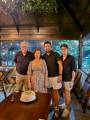 Foto com quatro pessoas sendo um senhor grisalho de calça bege e camiseta preta, uma senhora de vestido estampado e dois homens jovens vestindo bermudas claras e camisetas pretas. Eles estão em local aberto com cobertura de madeira e tem a frente deles uma mesa de madeira com um bolo de aniversário redondo sobre ela. Também na mesa uma colher de bolo. Em torno deles cadeiras de madeira e ao fundo paisagem verde com árvores e uma construção com vidraças.