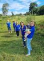 Um grupo de cinco mulheres e uma criança está em um campo gramado. Todas as mulheres estão vestindo camisetas azuis com o logotipo do Rotary Club e calças jeans. A mulher à direita está segurando a criança, que está usando um boné azul e uma camiseta verde. Ao fundo, há árvores e um céu azul com algumas nuvens. O ambiente parece ser uma área rural ou um parque. As mulheres estão sorrindo e parecem estar aproveitando o momento ao ar livre.