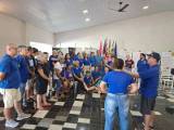 * A maioria veste camisetas azuis de manga curta, possivelmente uniformes de um evento ou organização.