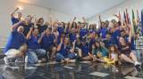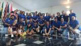 A imagem mostra um grupo grande de pessoas posando para uma foto em um ambiente interno, que aparenta ser um salão ou espaço de eventos. As pessoas estão dispostas em várias fileiras, algumas em pé e outras agachadas ou sentadas no chão.