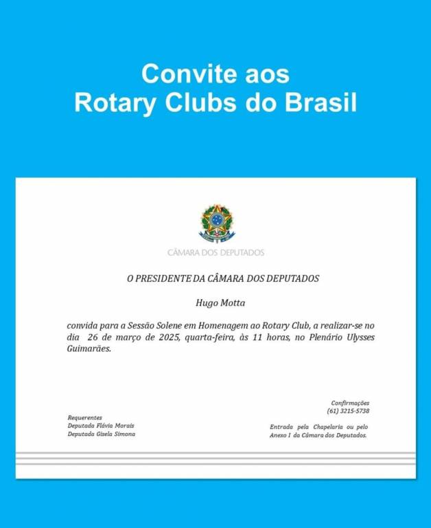 convida para a Sessão Solene em Homenagem ao Rotary Club, a realizar-se no dia 26 de março de 2025, quarta-feira, às 11 horas, no Plenário Ulysses Guimarães.