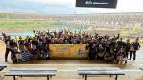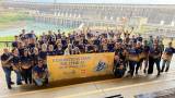 As pessoas na foto estão vestindo camisetas azuis com o logotipo do evento e segurando uma faixa com o mesmo logotipo. Há também uma bandeira do Uruguai no canto inferior esquerdo da foto. Ao fundo, a imponente Usina de Itaipu se estende, com suas comportas e turbinas visíveis.