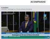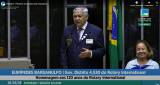 Cenário: O plenário está iluminado, com o orador posicionado em um púlpito ao centro. Atrás dele, as bandeiras do Brasil e da Câmara dos Deputados são visíveis, com um pano de fundo verde discreto.