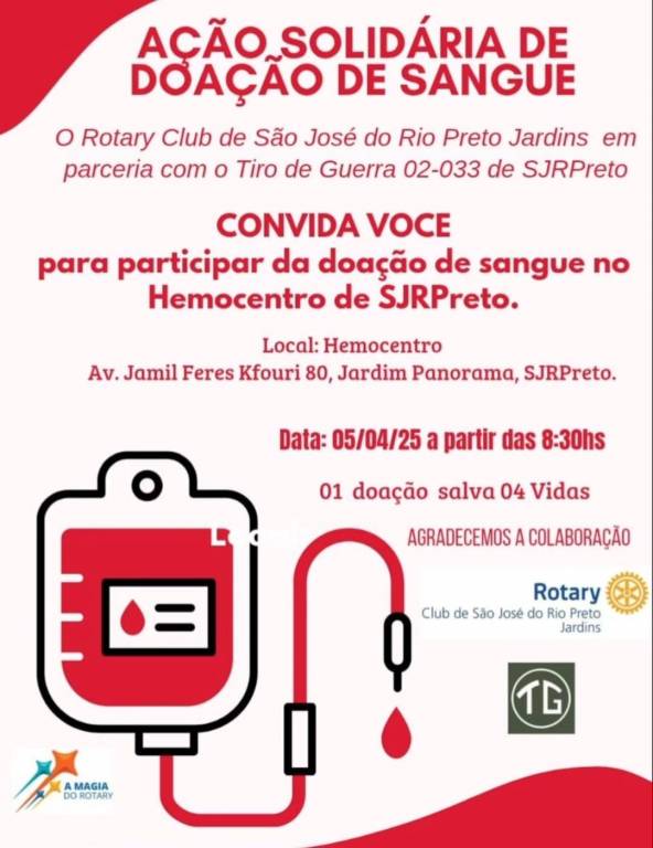 O Rotary Club de São José do Rio Preto - Jardins, em parceria com o Tiro de Guerra 02-033 de São José do Rio Preto, realizará no dia 05/04/25 a Ação Solidária de Doação de Sangue no HEMOCENTRO. Serão mais de 60 doadores.