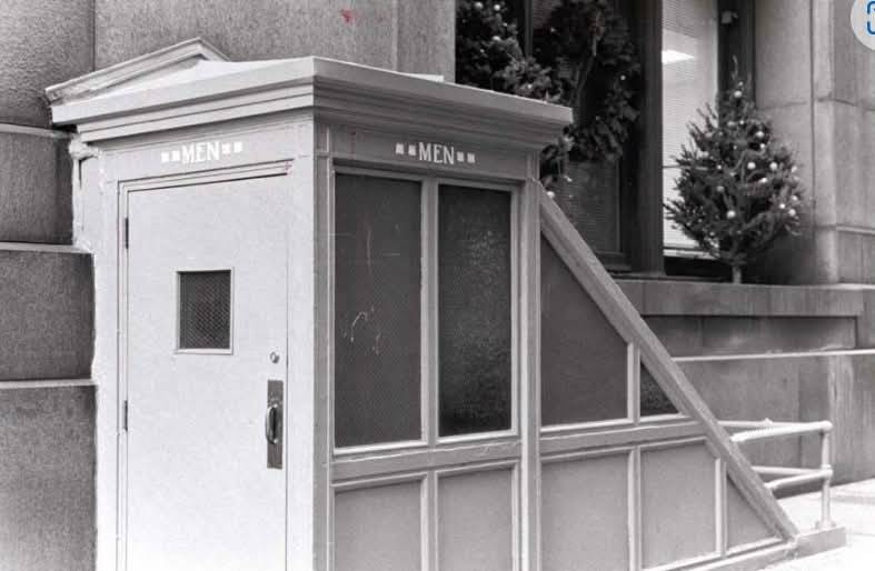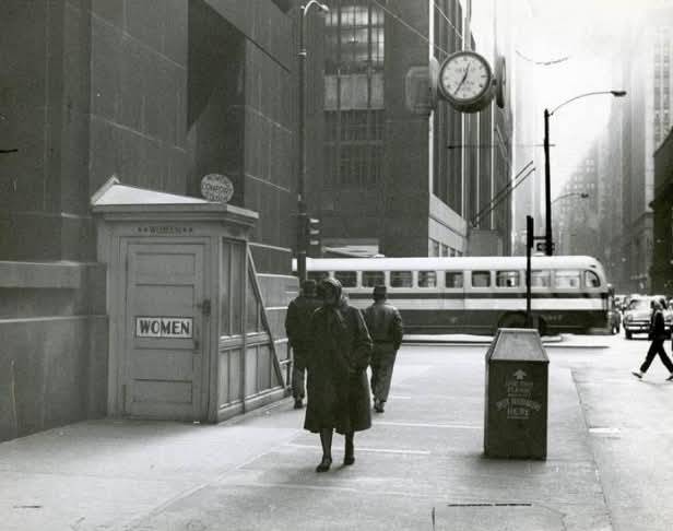Na lateral de um dos prédios observamos uma construção pequena, fechada, com uma placa escrito Women na porta.