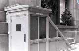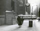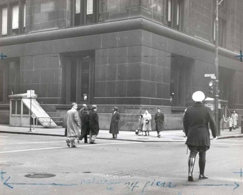 Foto antiga em branco e preto de parte de uma cidade onde observamos uma calçada larga com pessoas vestidas com roupas de inverno pesadas indo e vindo.