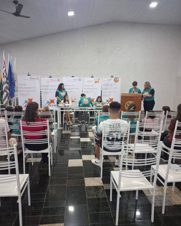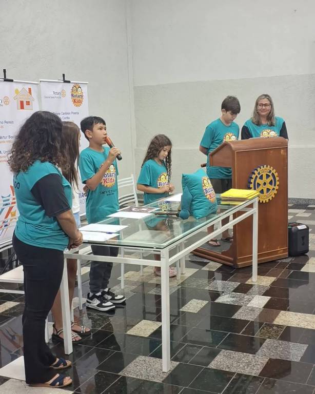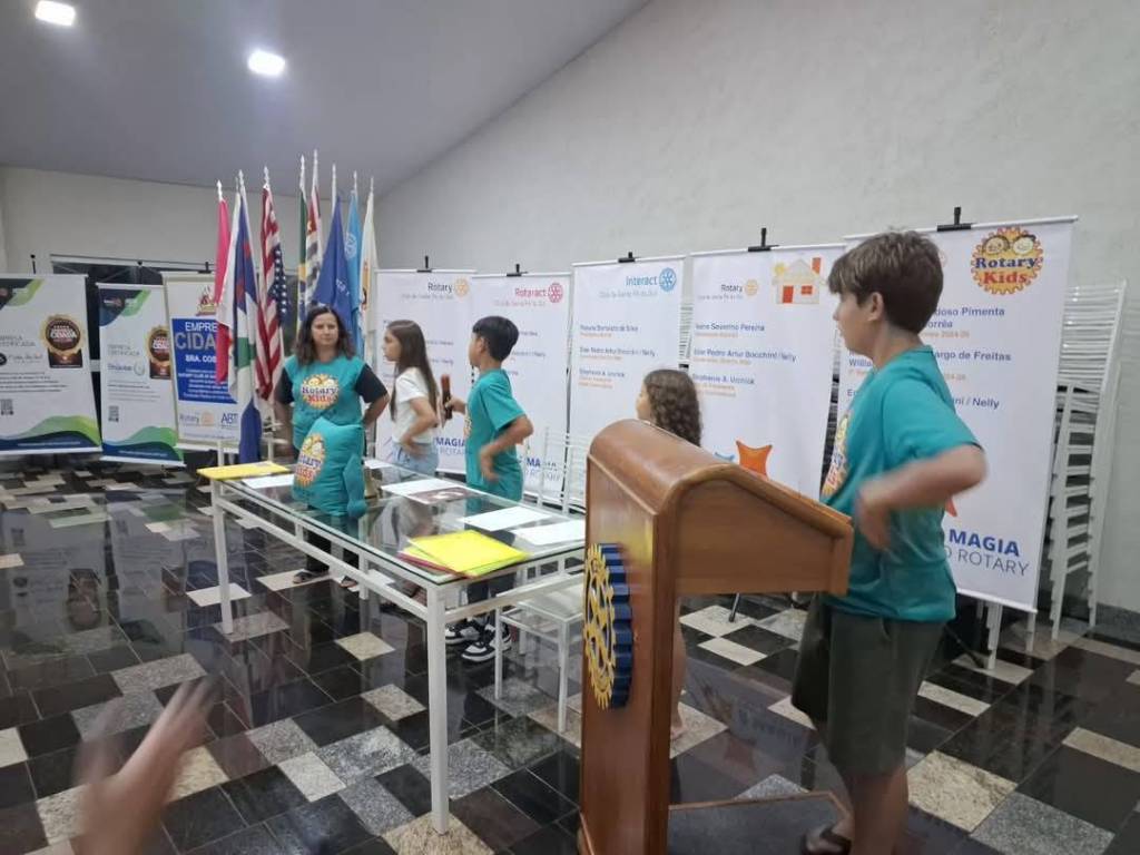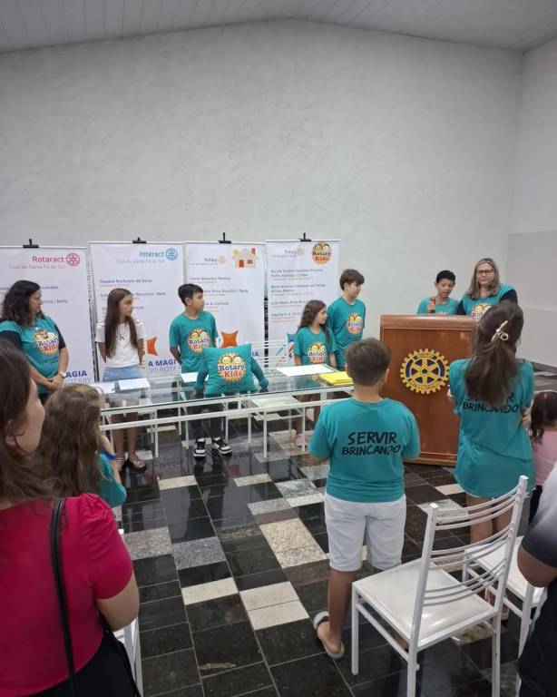 Neste momento estavam presentes os associados do Rotary Kids, Interact e Rotaract, além dos rotarianos Eduardo, Edlaine e a Pres. do Ano Rotária 2025-26 a Silvana Moretti, Damas da Casa da Amizade, convidados, pais e responsáveis.