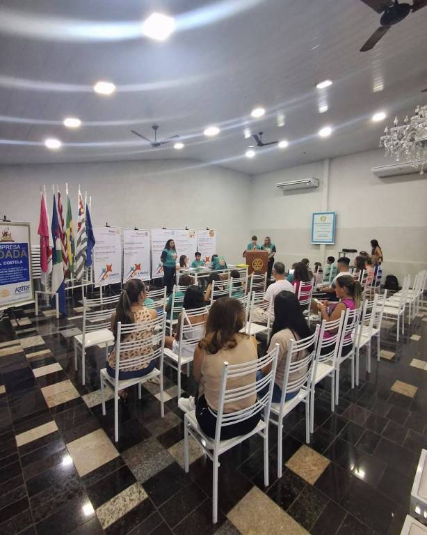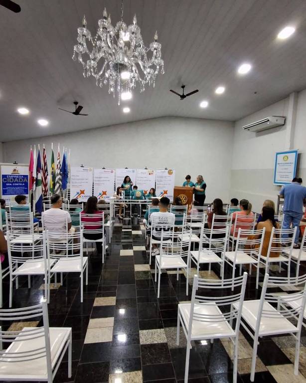 A imagem mostra uma reunião acontecendo em um salão com paredes brancas e piso de ladrilho escuro. As pessoas estão sentadas em cadeiras brancas, dispostas em fileiras, voltadas para uma pessoa que está falando em um púlpito. Há um projetor exibindo uma apresentação em uma tela branca ao fundo. A sala é bem iluminada e possui lustres de cristal no teto. Alguns banners com o logotipo do Rotary Club estão posicionados ao lado do púlpito.