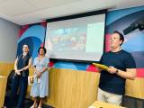 * Fundo: O fundo mostra um ambiente interno com paredes decoradas com padrões geométricos e uma tela de projeção com ícones de computador. Há também mesas de madeira e cadeiras.