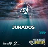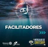 Conheça os Facilitadores & Jurados. Na direita três setinhas azuis. Finalizando o card no canto inferior esquerdo o símbolo do Rotaract Distrito 4480 e a logo da gestão atual A magia do Rotary ambos em branco e seguindo para a direita a logo do Mergulho de Oratória com a máscara de mergulho ao lado e abaixo em letrinhas brancas: Um treinamento de tirar o fôlego.