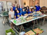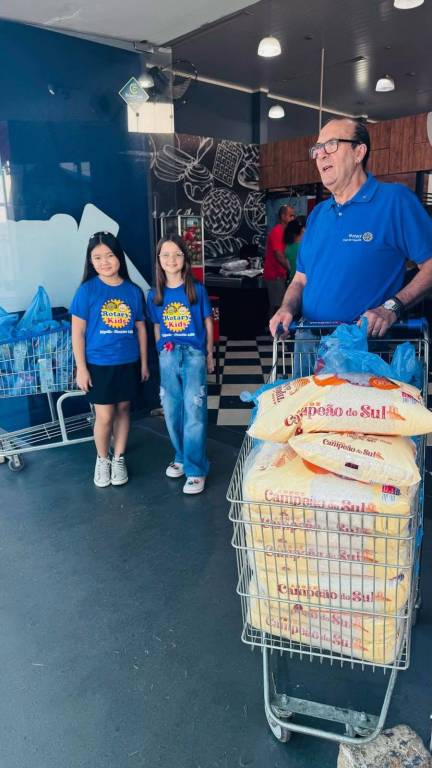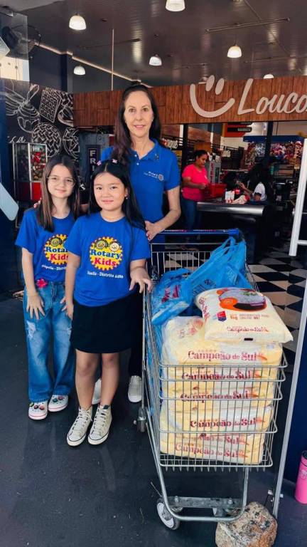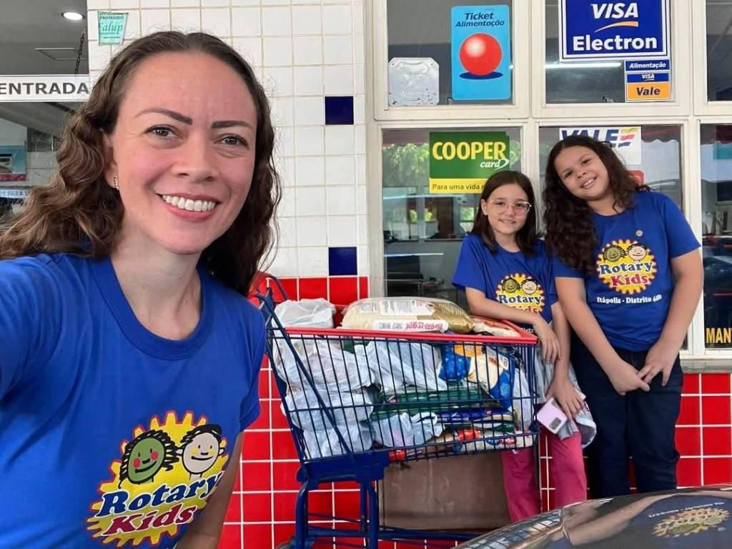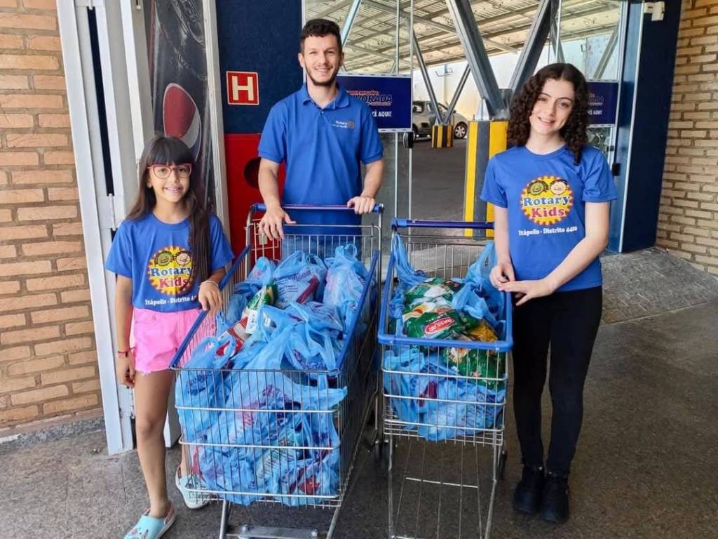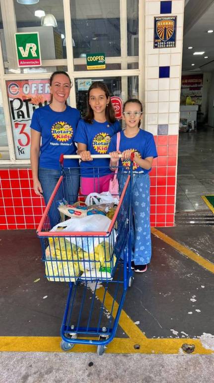 A atmosfera geral da imagem sugere uma ação de caridade ou um evento organizado pelo Rotary Kids para arrecadar ou distribuir alimentos. As pessoas parecem engajadas e positivas.