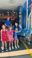 No centro, atrás da menina, outra menina com cabelos escuros e curtos também veste uma camiseta azul do "Rotary Kids". Um menino com cabelos escuros e uma camiseta azul lisa está ao lado dela.