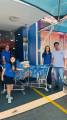 À direita, um grupo de crianças e adolescentes, todos vestindo camisetas azuis do "Rotary Kids", estão em pé atrás da mesa. Um jovem adulto com uma camiseta azul semelhante, também com o logo do Rotary, está no canto direito da imagem.