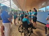 A maioria das crianças veste camisetas verdes com uma estampa amarela e azul, sugerindo que fazem parte de um grupo ou evento específico. Algumas delas seguram pequenos bolos decorados em embalagens plásticas. Uma das crianças está sentada em uma cadeira de rodas e também segura um bolo.