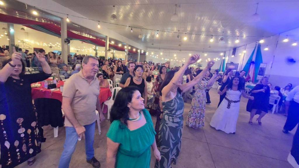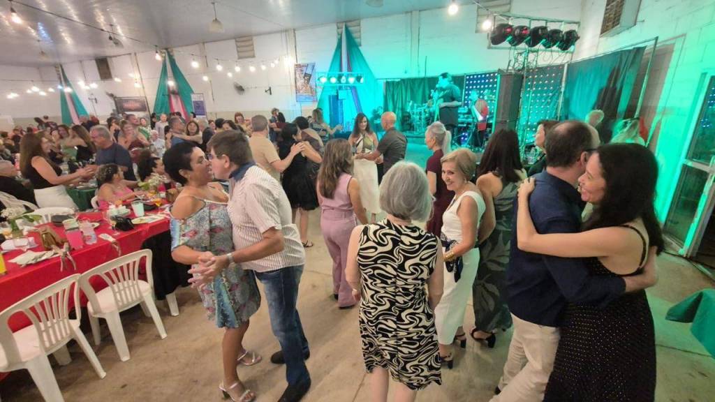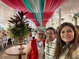 O grupo parece estar em um grande salão ou espaço para eventos, decorado com tecidos vermelhos, brancos e verdes pendurados no teto, além de luzes brancas. Ao fundo, é possível ver várias mesas redondas cobertas com toalhas vermelhas e cadeiras brancas, com pessoas sentadas nelas, sugerindo um jantar ou celebração. A atmosfera geral é alegre e social.