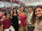 Um grupo de cinco pessoas está posando para uma selfie em um evento festivo. A foto parece ter sido tirada com um celular, com a mulher à direita segurando o aparelho e sorrindo para a câmera.