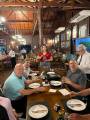 Uma mulher está no centro da imagem, sorrindo e segurando um pequeno embrulho de presente decorado com um laço vermelho. Ela tem cabelos castanhos longos e ondulados e veste uma camiseta vermelha e uma saia ou calça estampada em tons de azul e branco. Ela parece estar em um restaurante ou bar, com várias mesas e cadeiras de madeira visíveis ao redor. Algumas pessoas estão sentadas em outras mesas ao fundo, e há garrafas e copos sobre as mesas vazias em primeiro plano. A iluminação é quente e ambiente, sugerindo o interior de um estabelecimento acolhedor. As paredes são revestidas com painéis de madeira e há algumas decorações penduradas, incluindo o que parecem ser camisetas emolduradas. Uma grande coluna de madeira rústica se estende do chão ao teto à esquerda da mulher.