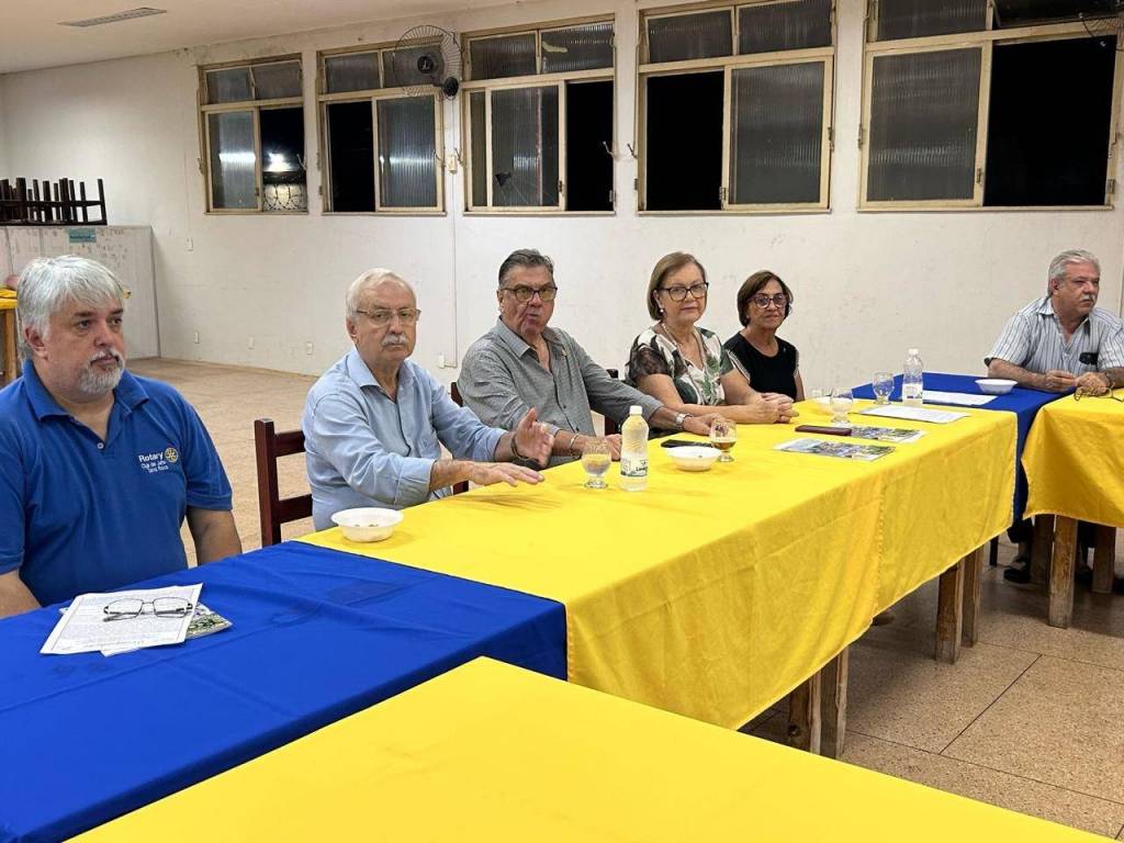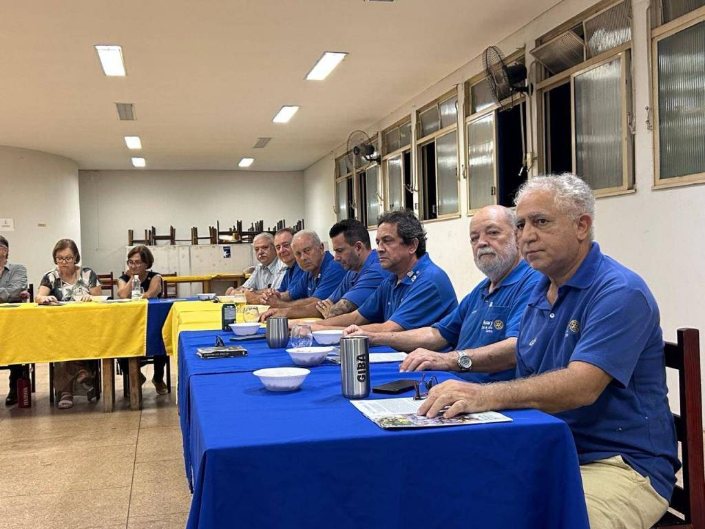 Na extremidade da sala, há um homem em pé atrás de um pódio, falando para o grupo. Atrás dele, há uma tela de projeção mostrando o que parece ser uma apresentação. Há também várias bandeiras em um mastro no canto esquerdo da sala e banners pendurados na parede com o logotipo do Rotary Club.