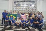 A presença das bandeiras do Brasil e dos Estados Unidos sugere uma possível conexão ou evento binacional, ou talvez uma celebração da diversidade dentro de um grupo ou organização. As expressões faciais das pessoas são sorridentes e positivas, indicando um clima amigável e de união.