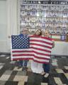 Um grupo de aproximadamente 30 pessoas está posando para uma foto em frente a uma parede com muitas fotos emolduradas. As pessoas parecem ser de diferentes idades e etnias. Eles estão segurando duas bandeiras: a do Brasil e a dos Estados Unidos.