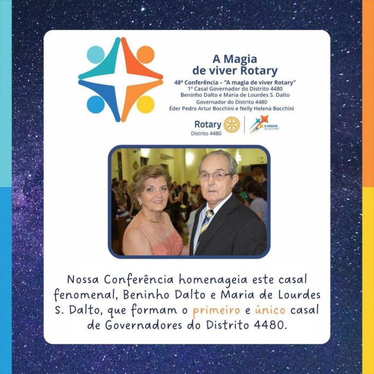 O convite destaca e homenageia um casal fenomenal: Beninho Dalto e Maria de Lourdes S. Dalto, que são o primeiro e único casal de Governadores do Distrito 4480.