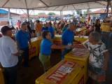 Foto em um dia claro de várias pessoas envolvidas no que parece ser uma grande festa. Em baixo de uma grande barraca branca observamos várias caixas térmicas grandes amarelas com logomarcas em vermelho. Observamos que as pessoas que estão entre as caixas servem as pessoas que estão transitando no local. Ao fundo mesas e cadeiras plásticas estão ocupadas por várias pessoas que participam da festa. Ao longe um cenário característico de cidade com construções e veículos.