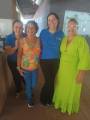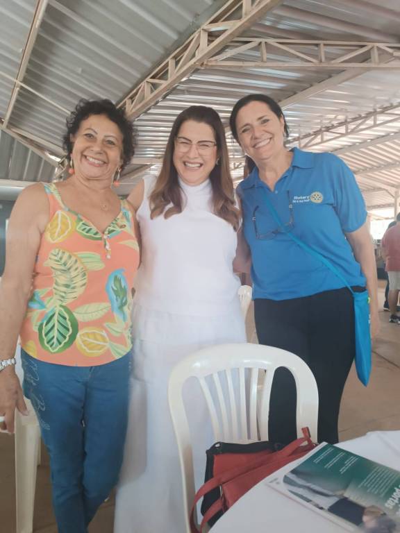 Foto de quatro mulheres sorridentes lado a lado. Duas delas vestem calça escura e camiseta polo azul do Rotary, uma de jeans com blusa estampada e a última na direita com um vestindo verde longo.