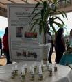 Foto com cinco pessoas lado a lado, sendo quatro mulheres e um homem. Duas das mulheres vestem camiseta vermelha iguais da Casa da Amizade. Eles estão posicionados atrás de duas mesas com toalhas claras e vários vidrinhos de spray distribuídos sobre elas . É dia e podemos observar atrás algumas construções e também um vaso com folhagem verde na direita.