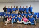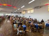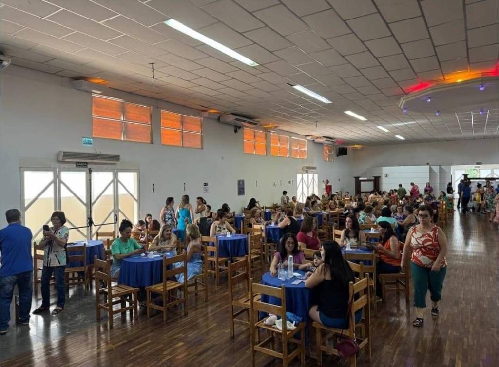 Uma grande sala com muitas pessoas sentadas em mesas redondas cobertas por toalhas azuis. As pessoas parecem estar em um evento social, conversando e interagindo. Há cadeiras de madeira ao redor de cada mesa. A sala tem um piso de madeira clara e paredes brancas. No teto, há luzes fluorescentes e algumas luzes decorativas vermelhas e amarelas. Algumas janelas retangulares com grades estão localizadas na parte superior da parede. Ao fundo, à esquerda, há mais pessoas em pé e algumas decorações na parede.