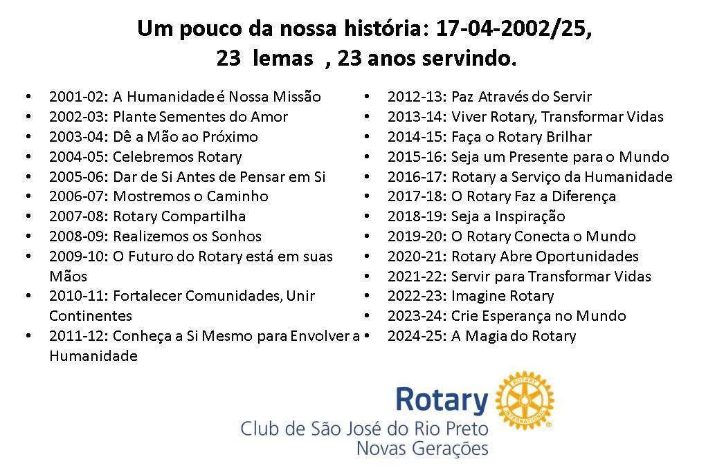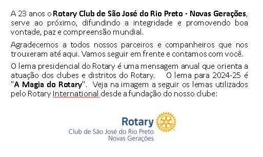 A imagem mostra uma mensagem do Rotary Club de São José do Rio Preto - Novas Gerações. Menciona que há 23 anos eles servem a comunidade, difundindo a integridade e promovendo boa vontade, paz e compreensão mundial.