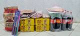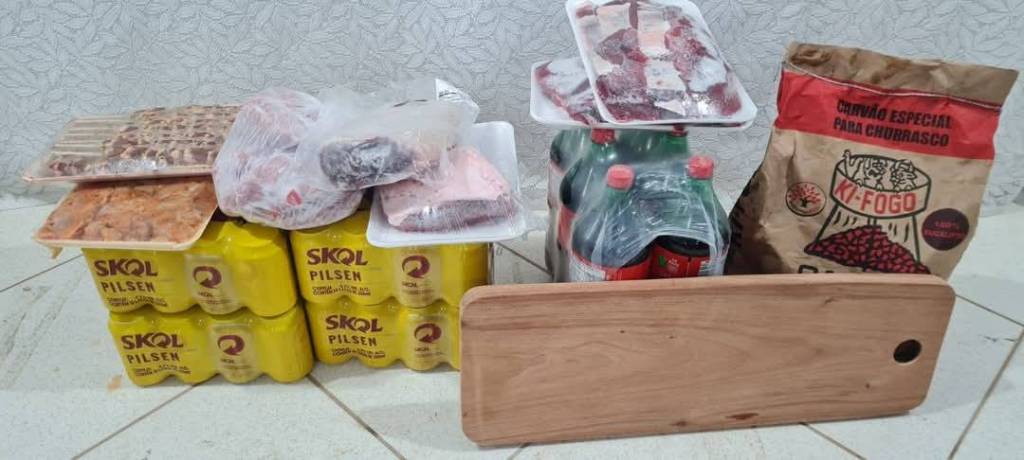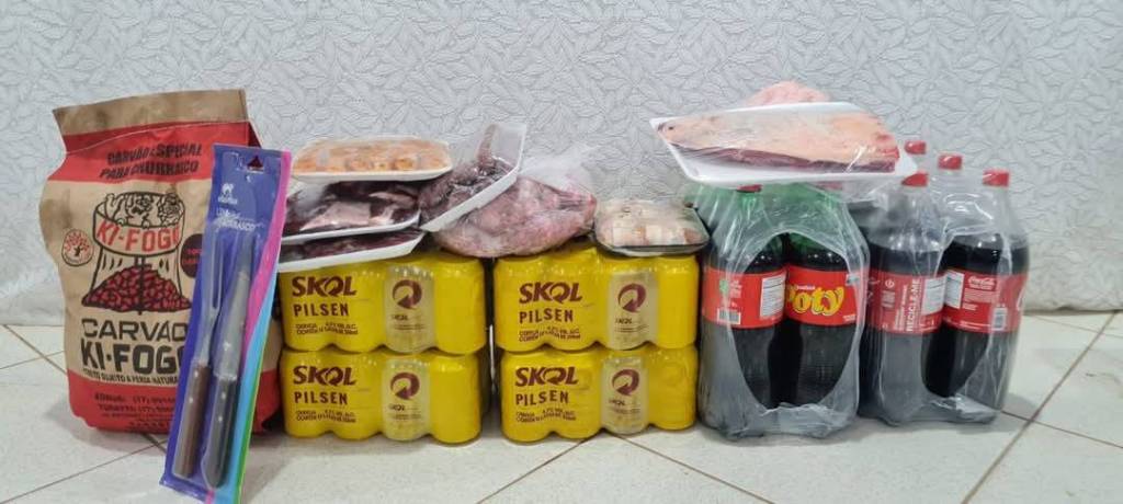 Na frente deles, no chão, há alguns pacotes de alimentos, incluindo o que parecem ser carnes embaladas, garrafas de refrigerante e uma caixa amarela.