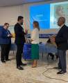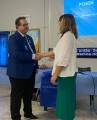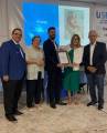 Pessoas adultas posam para uma foto em um evento interno. Ao centro, uma mulher de pele clara, cabelos castanhos na altura dos ombros e óculos segura um certificado emoldurado em dourado. Ela veste um vestido verde e um casaco branco aberto. À sua direita, um homem mais velho, de pele clara, cabelos grisalhos e óculos, sorri. Ele usa um blazer preto, camisa branca e jeans azuis. À esquerda da mulher com o certificado, um homem de pele clara, cabelos escuros e barba rala veste um terno preto sobre uma camisa branca. Ao lado dele, uma mulher de pele clara e cabelos loiros curtos veste uma blusa branca com listras pretas e calças pretas. Na extrema esquerda, um homem mais velho, de pele clara, cabelos grisalhos e óculos, veste um blazer azul sobre uma camisa branca e calças pretas. Todos sorriem para a câmera. Ao fundo, uma tela de projeção exibe a palavra "POSSE" em letras grandes e azuis, seguida por texto menor. À direita da tela, uma foto de uma mulher sorrindo está projetada. Uma faixa branca com texto azul e um logotipo parcialmente visível está pendurada na parede à direita. A iluminação do ambiente é artificial e clara.