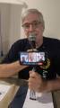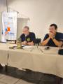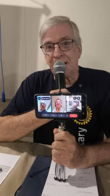 À direita, um homem mais velho, de pele clara e cabelos grisalhos curtos, usa óculos e veste uma camiseta azul escura com o mesmo emblema do Rotary Club no lado esquerdo do peito. Ele também segura o certificado, próximo ao homem central.