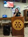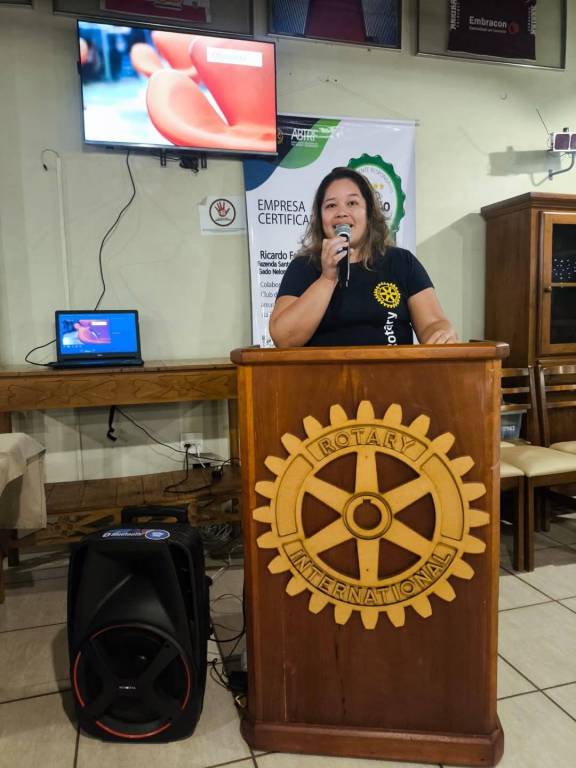 À esquerda, uma mulher de pele clara, cabelos curtos castanhos e óculos pendurados no decote veste uma camiseta azul escura com o emblema do Rotary Club no lado esquerdo do peito e uma pulseira dourada no pulso direito.