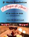 O cartaz anuncia a "8ª Noite Romântica - A Magia do Amor". O evento acontecerá no dia 7 de junho de 2025, a partir das 21 horas, na sede do Rotary Club de Santa Fé do Sul. Haverá música ao vivo com o Gil Faimer Show. O valor é de R$ 290,00 por casal.
