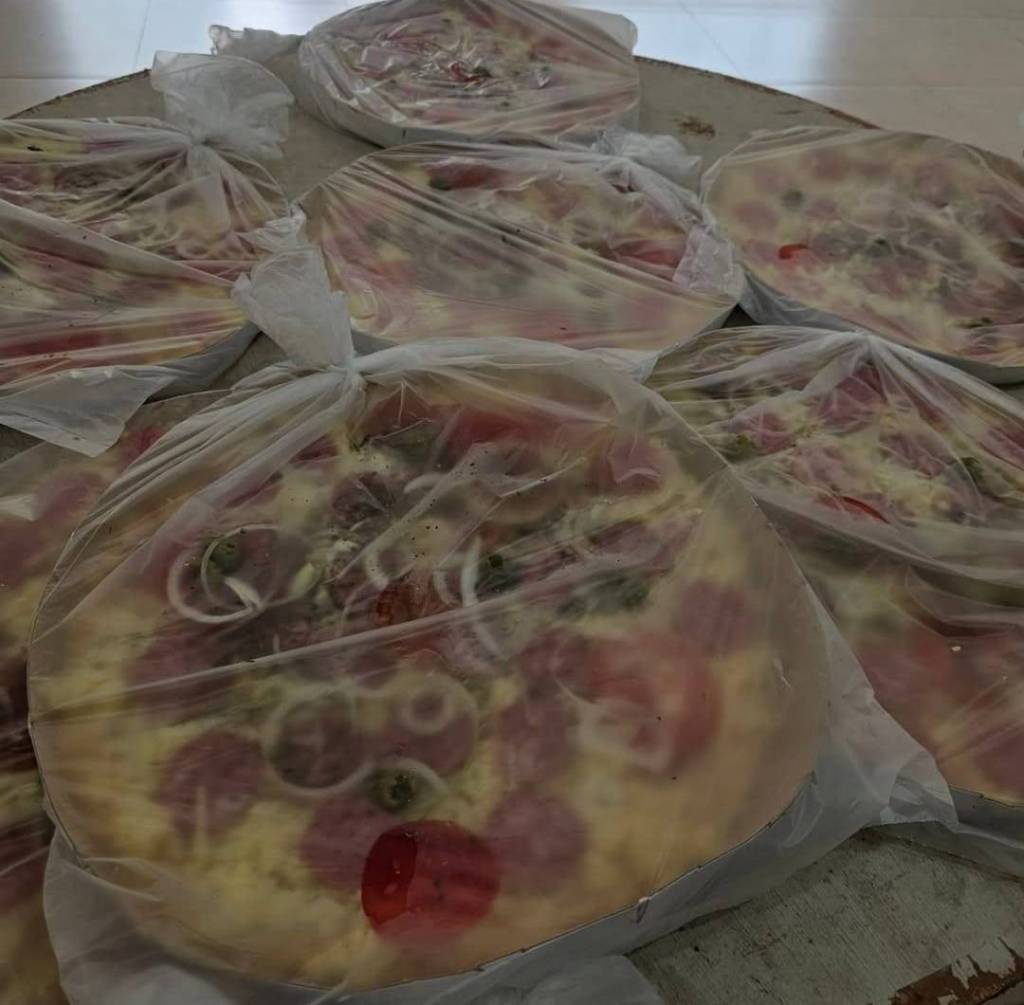 Foto de um homem grisalho vestindo camiseta polo escura ao lado de um rapaz jovem com camiseta de time de futebol, usando óculos e toca higiênica na cabeça. Eles seguram nas mãos uma pizza semi pronta embalada em um saquinho plástico. À frente deles em mesas brancas temos pizzas redondas semi prontas.