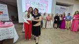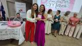 Foto ao fundo de três mulheres, duas mais próximas e uma ao lado, estando duas delas com caixinhas rosas na mão.