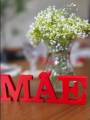 A imagem mostra em foco a palavra "MÃE" escrita em letras grandes e vermelhas, feitas de algum tipo de material sólido, possivelmente madeira ou plástico. As letras estão dispostas lado a lado sobre uma superfície de madeira clara, com um brilho suave que sugere que a superfície é lisa e talvez envernizada.