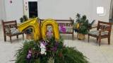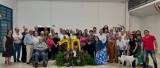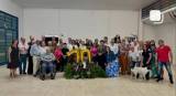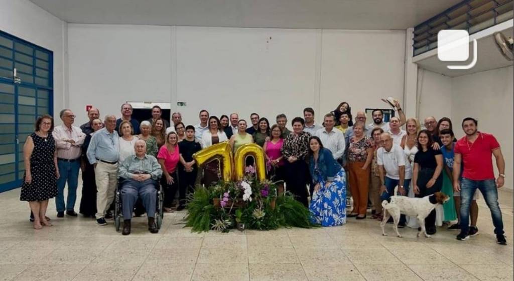 A imagem mostra um grupo de aproximadamente 30 pessoas reunidas em um ambiente interno, posando para uma fotografia. Elas estão dispostas em diferentes posições, algumas em pé e outras sentadas. No centro da imagem, há grandes balões dourados formando o número "70", cercados por uma decoração com flores e folhagens, sugerindo uma comemoração especial. No lado direito da imagem, há um cachorro em pé, aparentemente parte do evento. O local parece ser um salão comunitário ou um espaço para eventos. A cena indica uma celebração significativa, do aniversário de 70 anos do Rotary Club de Novo Horizonte.