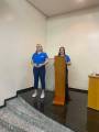 Dois indivíduos adultos, uma mulher de pele clara com cabelos loiros e um homem de pele clara com barba rala e cabelos castanhos, estão lado a lado em um ambiente interno. A mulher está à esquerda, vestindo uma camisa polo azul, calças azuis e um cinto marrom. Ela sorri para a câmera. O homem à direita veste uma camisa de botões azul clara, calças cáqui e sapatos bege. Ele segura um certificado emoldurado com uma mão e uma sacola de papel marrom com a outra. Ele também sorri para a câmera.