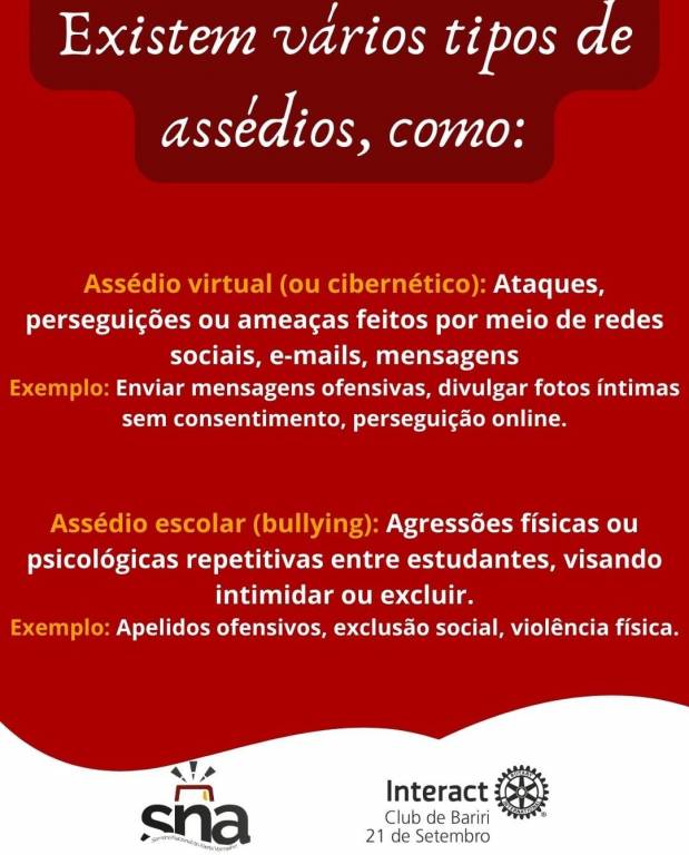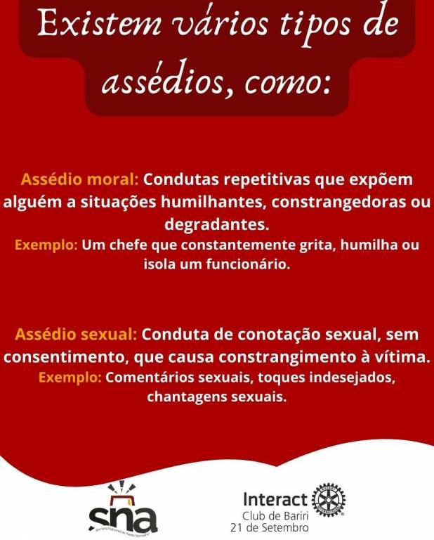 A imagem é um cartaz promocional do evento "Semana Nacional Alerta Vermelho", organizado pelo Interact Club de Bariri e programado para o dia 21 de setembro. O cartaz destaca o tema "Dia 4: o assédio vai muito além do NÃO", enfatizando que o problema do assédio é mais amplo do que simplesmente recusar uma abordagem indesejada.