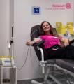 Uma mulher jovem de pele clara, cabelos castanhos longos e óculos está sentada em uma cadeira de doação de sangue, sorrindo para a câmera. Ela veste uma camiseta rosa com a inscrição "ROTARACT" e calças pretas. Seu braço direito está estendido e uma agulha está inserida em sua veia, conectada a um equipamento de coleta de sangue ao lado esquerdo da imagem.
