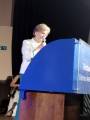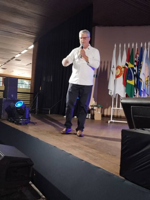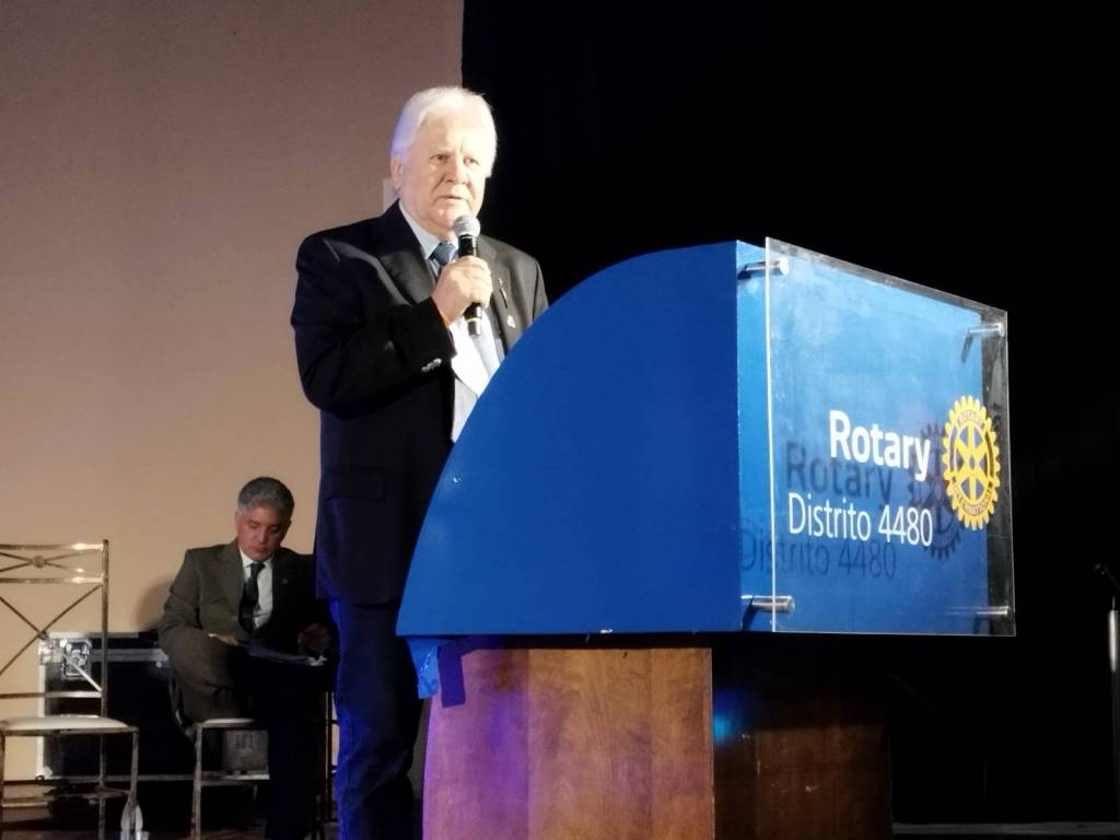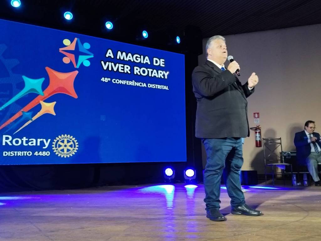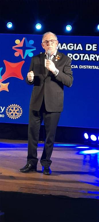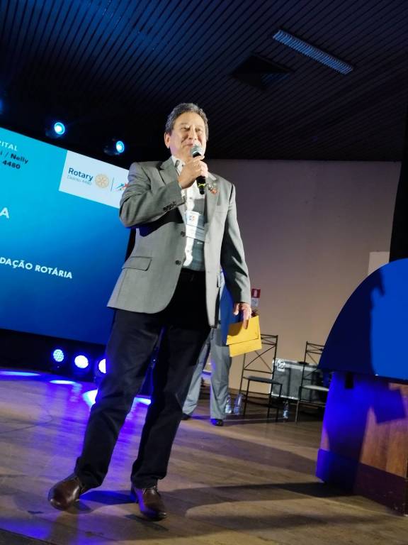 Foto com foco da esquerda para a direita traz um senhor segurando um microfone próximo à boca apoiado por uma tribuna de madeira com uma grande bancada azul e na frente um painel de vidro com o símbolo do Rotary na frente.