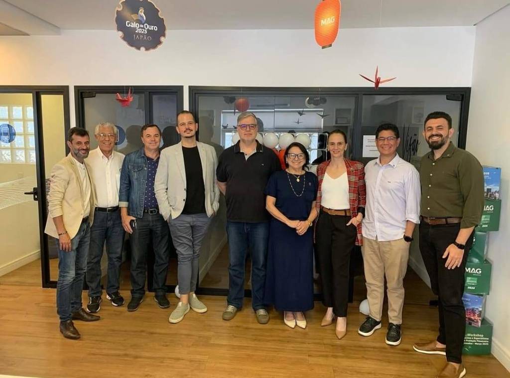 Ao fundo, há paredes brancas e, à esquerda, uma porta de vidro. À direita, pilhas de caixas verdes com a inscrição "MAG 2024". No alto da parede, há decorações como um banner redondo com "Galo de Ouro 2023 - IMÃO" e alguns origamis de pássaros vermelhos pendurados. O chão é de madeira clara. A iluminação parece ser artificial e clara.