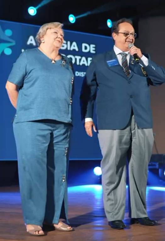 Ao fundo, uma projeção azul clara com texto parcialmente visível que parece ser "ASSEMBLEIA DE ROTARY" ou algo similar, com a palavra "DISTRITO" mais abaixo. A iluminação geral do palco é suave, destacando as duas figuras.