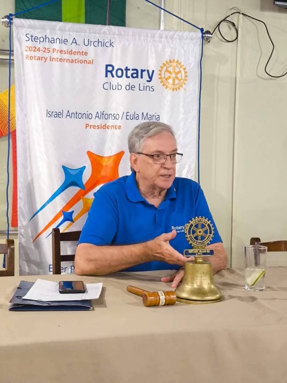 Sobre a mesa à frente do homem, há uma sineta dourada, um pequeno martelo de madeira ao lado, alguns papéis, um telefone celular e um copo com uma bebida e uma rodela de limão. O homem também usa um broche na camisa com o logotipo do Rotary.