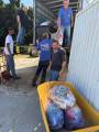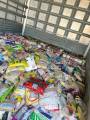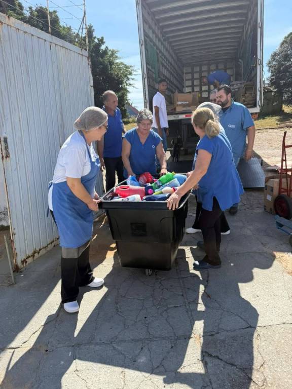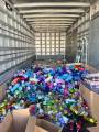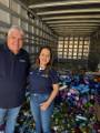 A imagem mostra um homem e uma mulher, ambos aparentemente de meia-idade, sorrindo para a câmera enquanto estão dentro da parte traseira de um caminhão de entregas. O caminhão está quase completamente cheio com uma grande quantidade de garrafas plásticas de diversas cores e tamanhos, algumas cheias e outras vazias.