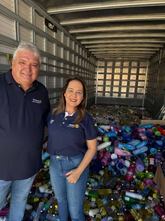 O homem está à esquerda, vestindo uma camisa polo azul escura com um logotipo "Rotary" no peito. Ele tem cabelos grisalhos curtos e um sorriso amigável. A mulher está à direita, também vestindo uma camisa polo azul escura com um logotipo "Rotary" similar e calça jeans. Ela tem cabelos castanhos escuros e um sorriso acolhedor. Ambos parecem orgulhosos ou satisfeitos com o que está ao redor deles. O interior do caminhão parece ser de metal corrugado, e a luz entra por cima.