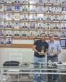 A imagem mostra dois homens sorridentes, um à esquerda e outro à direita, posando para uma foto em um ambiente interno. O homem da esquerda é moreno, com cabelo escuro e curto, e veste uma camisa polo preta e calça jeans. Ele segura um troféu dourado em formato de sino com uma engrenagem no topo, e tem barba rala. O homem da direita é um pouco mais alto, com cabelo grisalho e óculos. Ele veste uma camisa social azul clara de manga curta com alguns patches e calça jeans, e também segura um troféu dourado semelhante ao do outro homem.